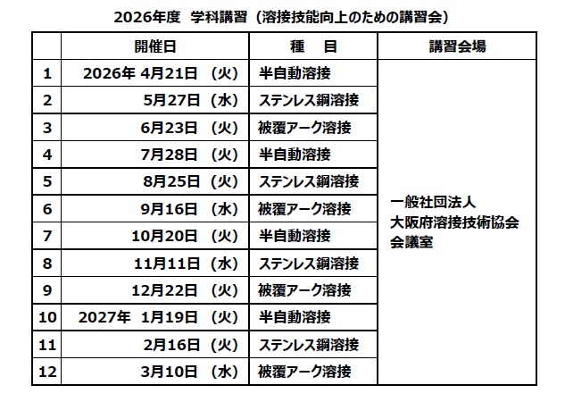2026年度・学科講習(溶接技能向上のための講習会)の日程が決まりました。