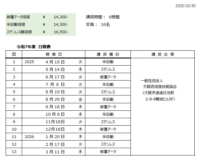 | 被覆アーク溶接 | 16名 | 6時間 | ¥14,300- |